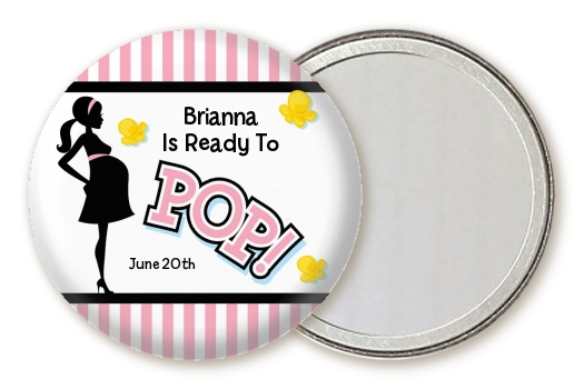 Our Ready To Pop Blue Baby Shower Pocket Mirrors are the perfect themed favor. Each adorable mirror is personalized with your custom text and is designed to match our Ready To Pop Blue theme perfectly.