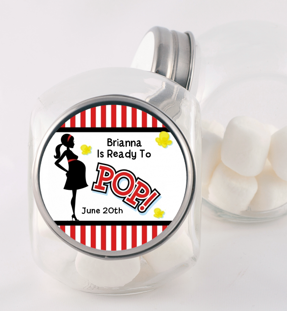 Use our personalized Baby Shower Ready To Pop Pink candy jars as a stylish way to give some sweet treats to your guests. These unique Baby Shower Jars measure 2 �½” tall when standing upright and almost 1 �½” wide. The candy jar favors are made of glass and feature a unique depression or flat area on the belly which allows you to sit them at an angle so that the customized label can be seen.