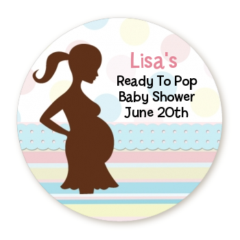 About our Ready To Pop Yellow and Gray Plaid Baby Shower custom round sticker labels