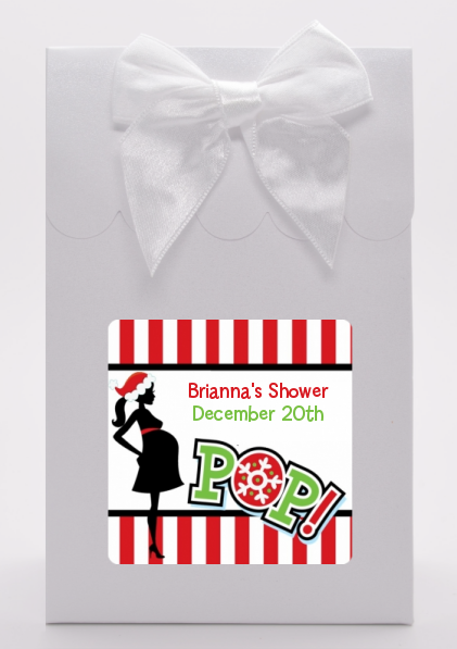 Why not add our She's Ready To Pop Blue custom favor bags to complete your Baby Shower theme! These favors are shaped like a bag and are constructed out of stiff cardboard. Our custom favor or goodie bags are shipped flat complete with free satin bows and custom She's Ready To Pop Blue labels, all you need to do is assemble them and stick on the adhesive bows and stickers!