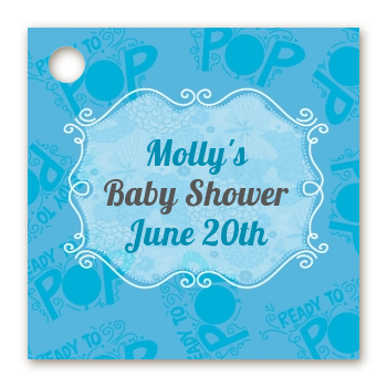 Our She's Ready To Pop Blue Baby Shower custom square sticker labels are the perfect way to add a little style to a "do it yourself" Baby Shower project, store bought favors or even a Baby Shower gift.