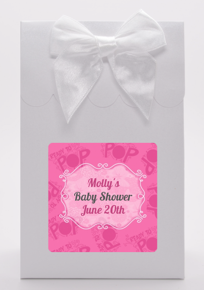 Why not add our She's Ready To Pop Christmas Edition custom favor bags to complete your Baby Shower theme! These favors are shaped like a bag and are constructed out of stiff cardboard. Our custom favor or goodie bags are shipped flat complete with free satin bows and custom She's Ready To Pop Christmas Edition labels, all you need to do is assemble them and stick on the adhesive bows and stickers!